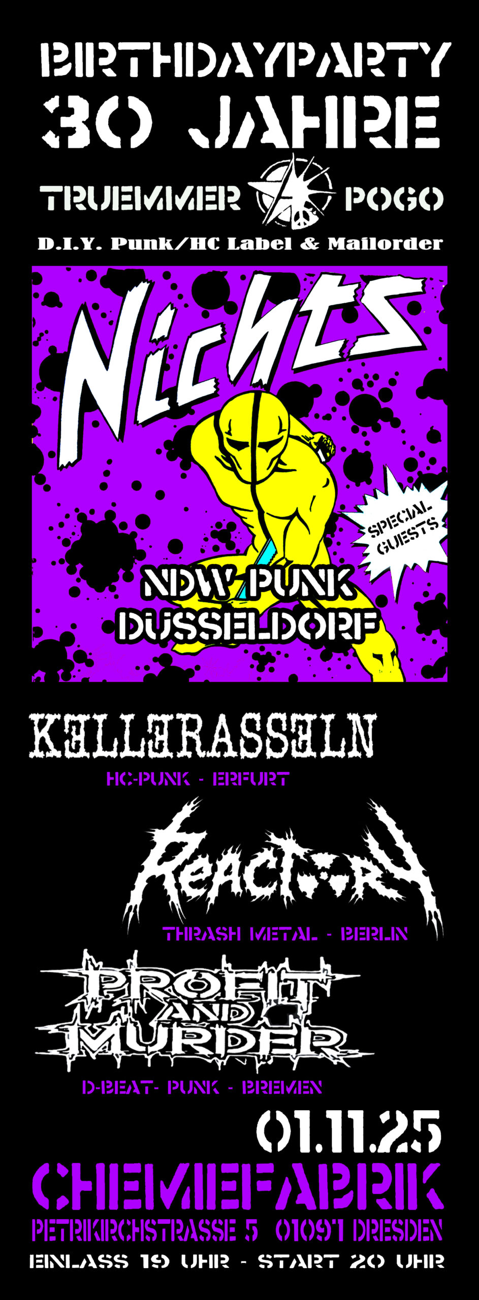 Außerdem wird NICHTS aus Düsseldorf aufspielen, welche einige Klassiker der 80iger Punk/NDW Geschichte gezaubert haben. Freut euch auf Songs wie „Radio“, „Eingeschlossen“, „Tango 2000“, „10 Bier zuviel“ und Songs vom großartigen neuen Album „Tiefschwarz“!