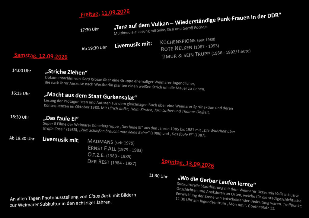 Und was könnte besser dazu passen als ein dreitägiges Festival, rund um die Weimarer Subkulturelle Szene der ehemaligen DDR zu organisieren. Wie dankbar sind wir, dass wir bei dieser Idee auf so viele offene Ohren stießen, die Lust haben mitzumachen. Seien da die Musiker und Künstler, welche sich bereit erklärt haben in diesem Rahmen nach teilweise über 35 Jahren noch einmal aufzutreten, aus ihren Biographien zu lesen, Fotos und Filme zu zeigen und uns mit auf eine Zeitreise zu nehmen, oder die Unterstützer für das leibliche Wohl, die Technik, die Bar und so weiter. Herausgekommen ist ein buntes Programm in Zusammenarbeit mit dem Gaswerk e.V. Weimar, Radio Lotte, dem Institut B3, dem Gerberstraßen e.V., dem Heldenstadt Anders e.V. sowie den Labels Lion Crew Records, Black Cat Tapes und Elbtal Records.